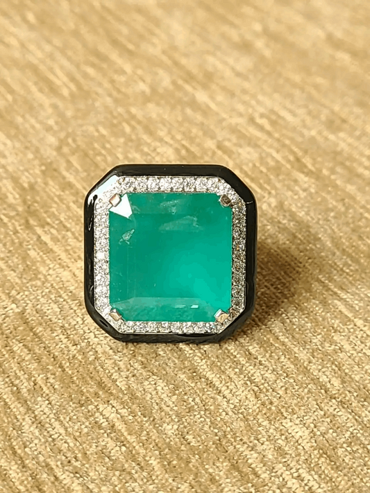 Zambian Emerald Black Enamel & Diamonds Cocktail/ Engagement Ring