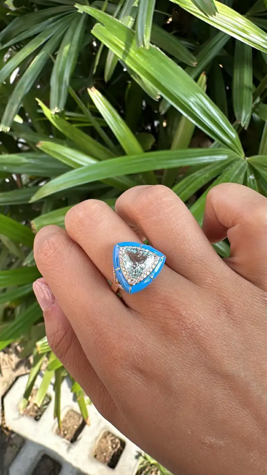 Trillion Shape Aquamarine Ring - Blue Enamel & Diamond Minimalist Ring - 18k Gold Diamond Women Ring