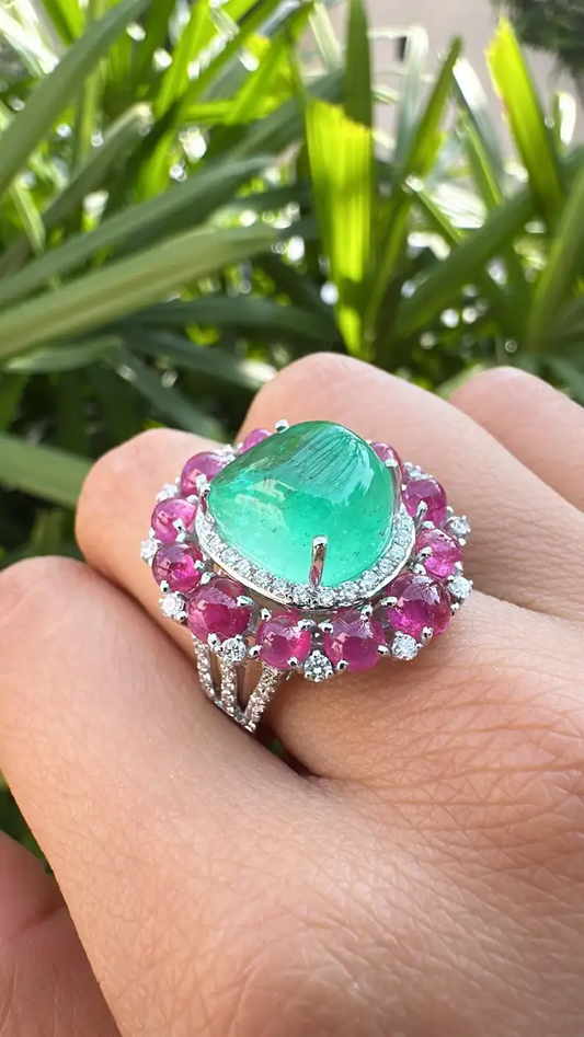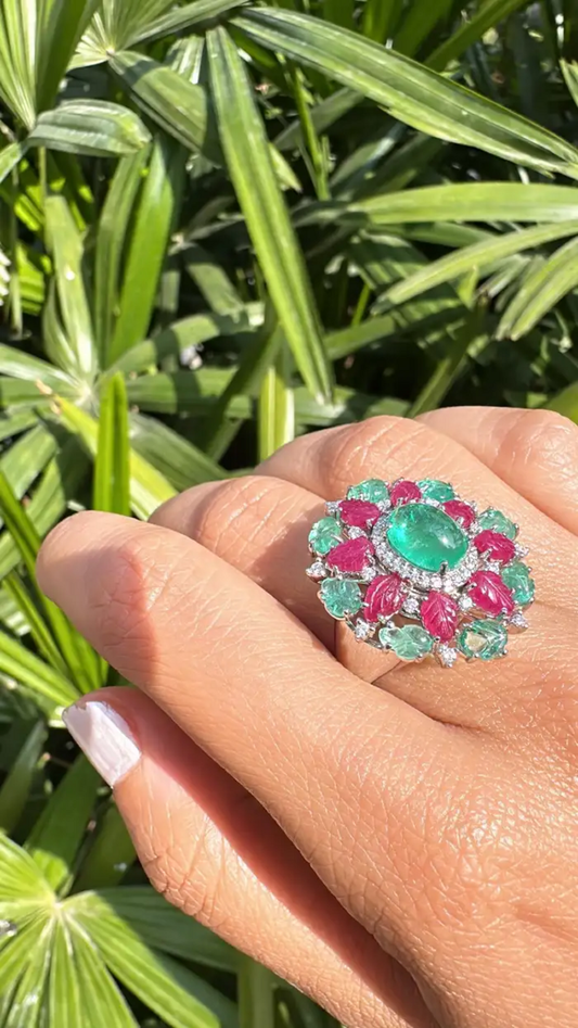 18k White Gold Carved Emerald & Ruby Gemstone Ring - Natural Colombian Emerald Cocktail Ring
