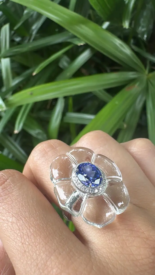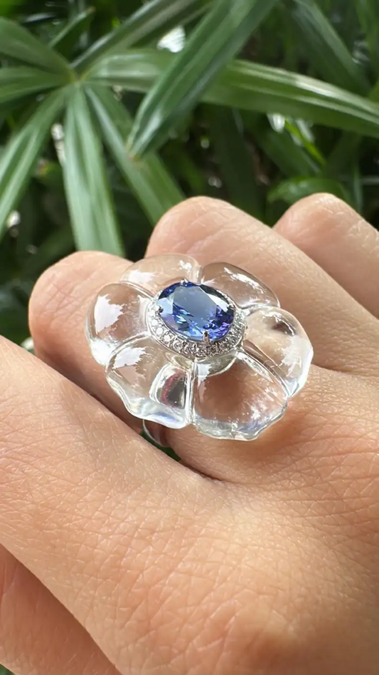 18k White Gold Diamond Cocktail Ring - Natural Tanzanite & Crystal Ring