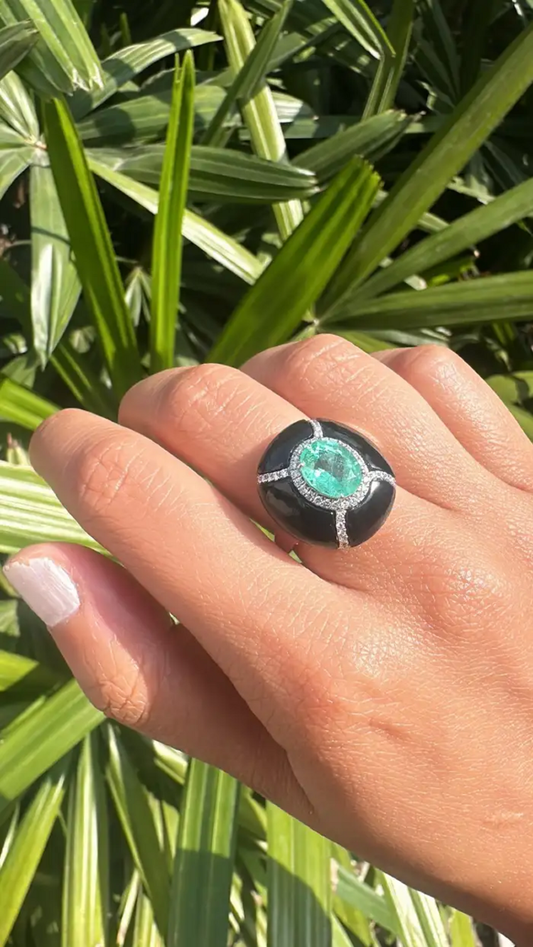 18k White Gold Diamond Cocktail Ring - Natural Colombian Emerald & Black Onyx Statement Ring