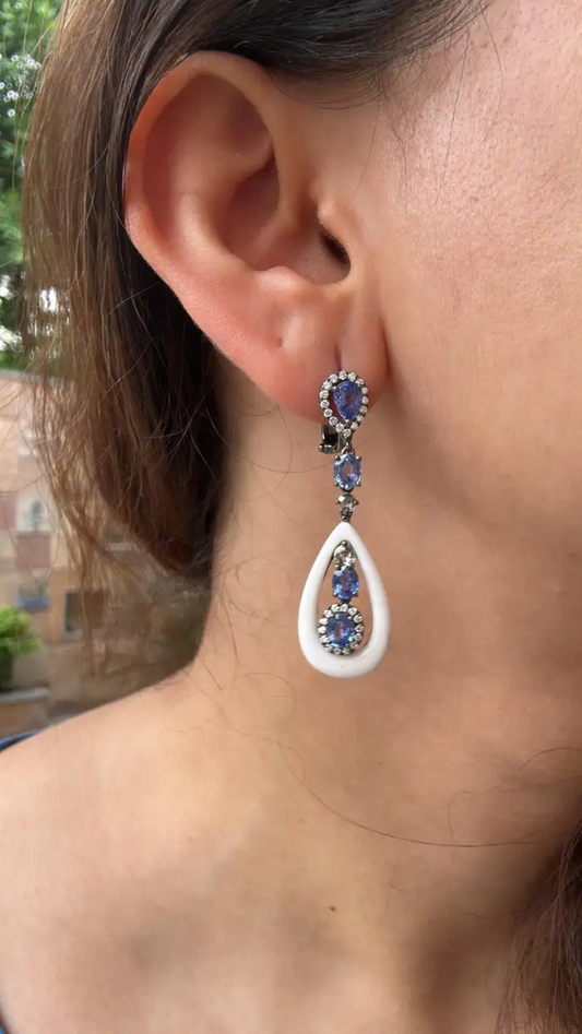 18k White Gold Diamond Dangle Earrings - Natural Blue Sapphire & Onyx Earrings