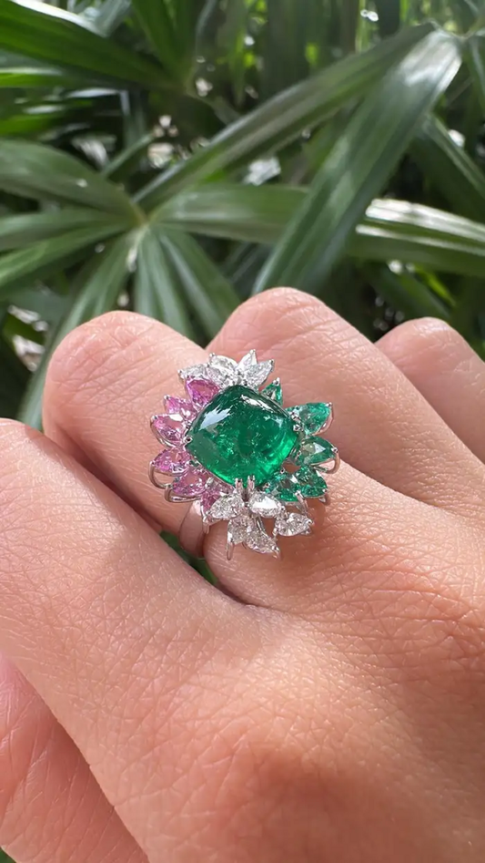 18k White Gold Diamond Cocktail Ring - Natural Zambian Emerald & Pink Sapphire Wedding Ring