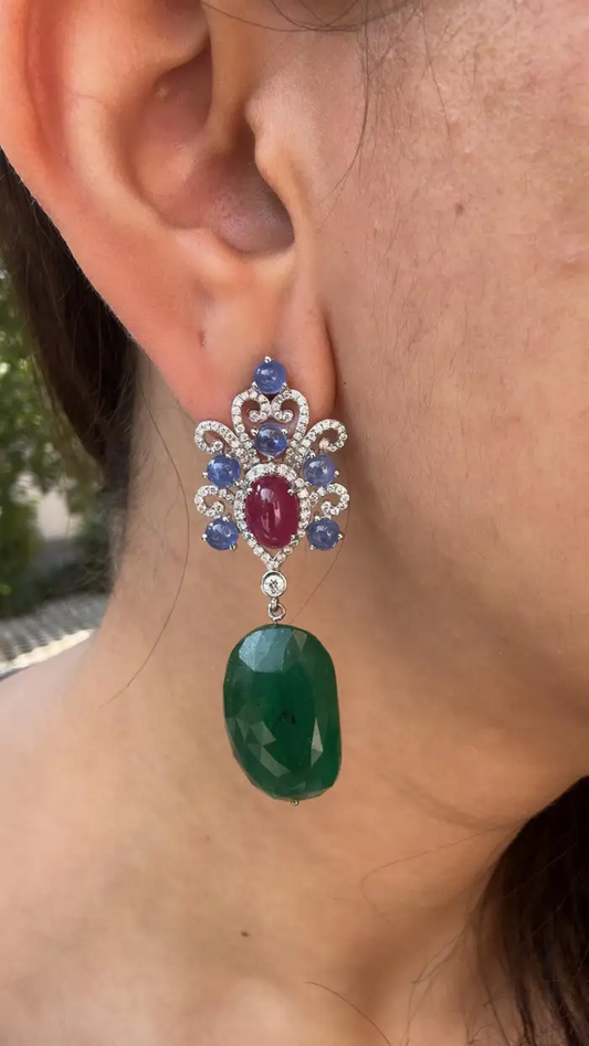 18k White Gold Diamond Dangle Earrings - Natural Blue Sapphire, Mozambique Ruby & Zambian Emerald Tumble Earrings