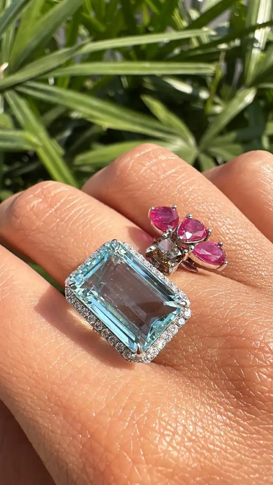 18k White Gold Diamond Cocktail Ring - Natural Colombian Emerald & Ruby Statement Ring