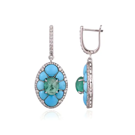 18k White Gold Diamond Dangle Earrings - Natural Emerald & Turquoise Gemstone Earrings