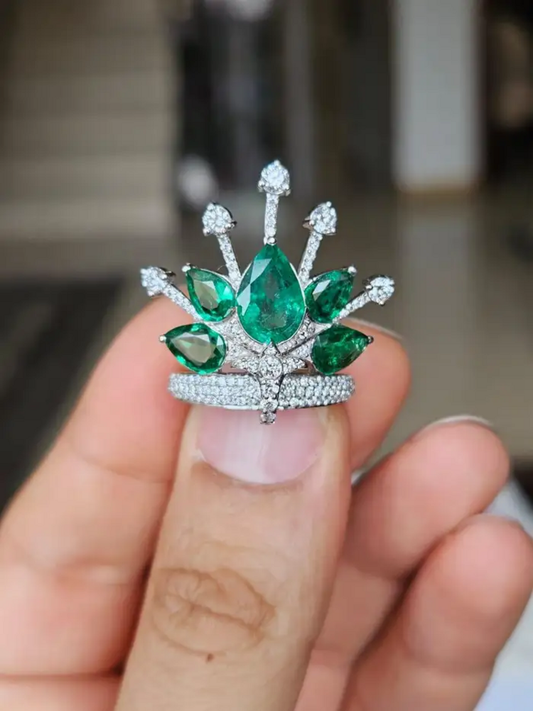 18k White Gold Diamond Crown Ring - Natural 3.80 Ct Zambian Emerald Wedding Ring