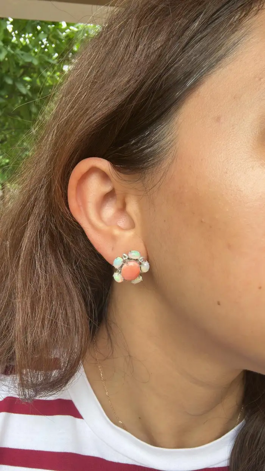 18k White Gold Rose Cut Diamond Stud Earrings - Natural Ethiopian Opal & Coral Earrings