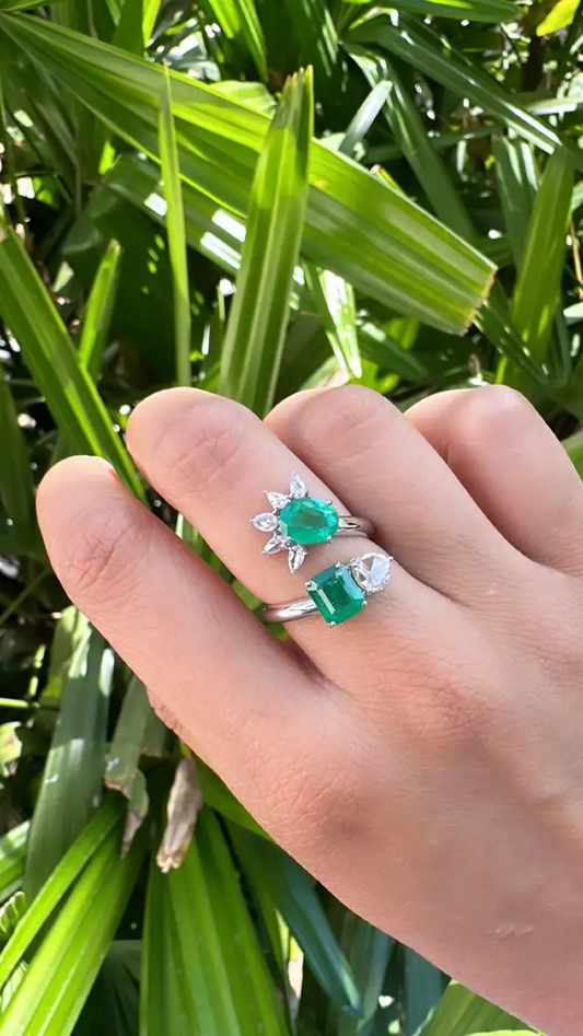 18k White Gold Ring - Natural Zambian Emerald Wrap Ring - Rose Cut Diamond Cuff Ring