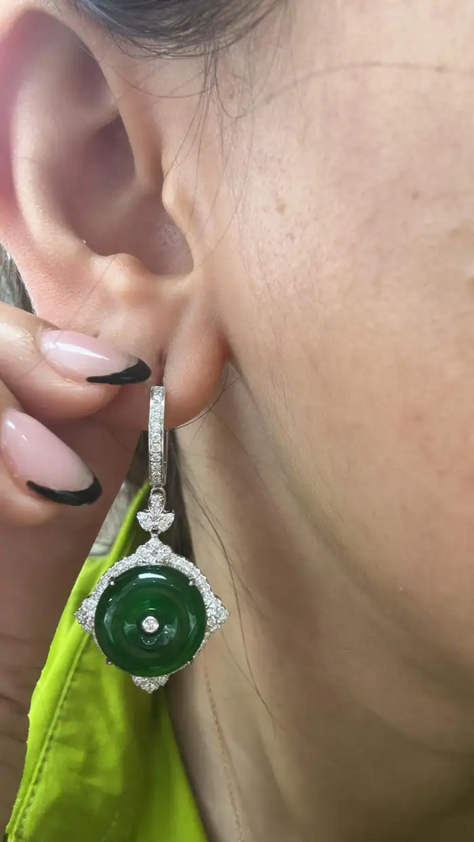18k White Gold HKJSL Certified, Fei Cui Jade & Diamonds Dangle Earrings