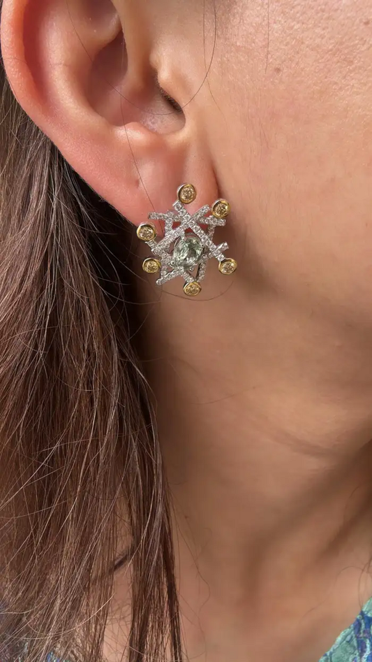 18k White Gold Handmade Stud Earrings With Yellow Diamonds - Natural Blue & Green Sapphire Stud Earrings
