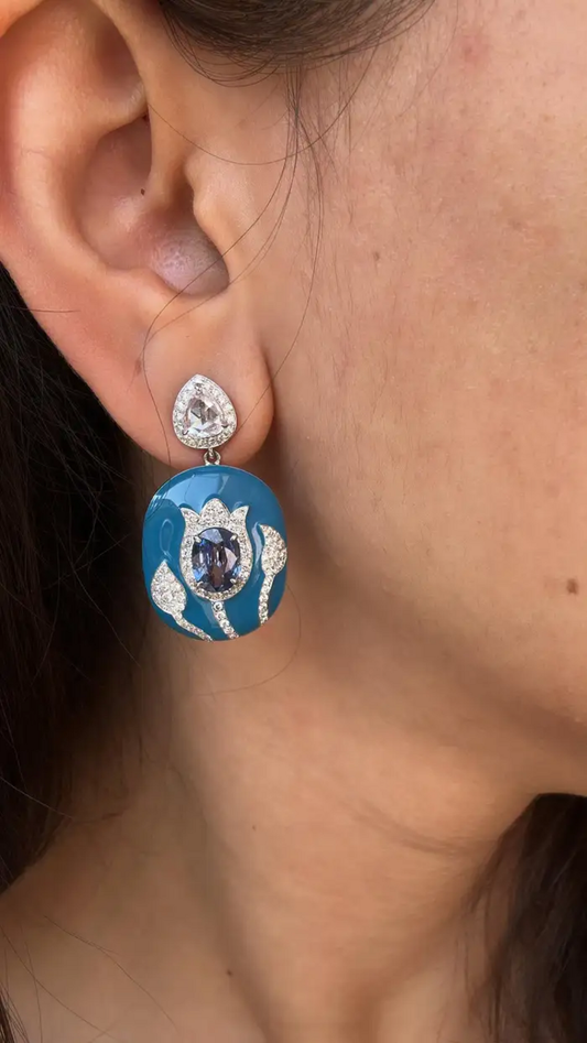 18k White Gold Rose Cut Diamond Handmade Dangle Earrings - Natural Blue Sapphire & Blue Enamel Earrings