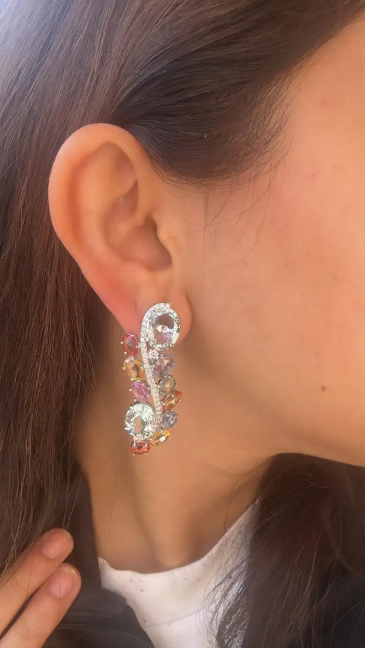 18k White Gold Multi Sapphire Chandelier Earring - Natural Aquamarine & Diamond Earrings