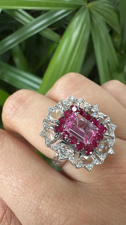 18k White Gold Rose Cut Diamond Cocktail Ring - Natural Ruby & Pink Sapphire Wedding Ring