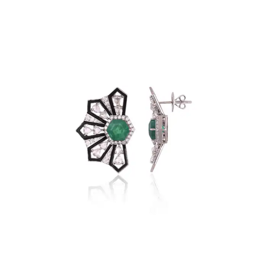 18k White Gold Handmade Stud Earrings - Natural Zambian Emerald & Diamond Women Earrings