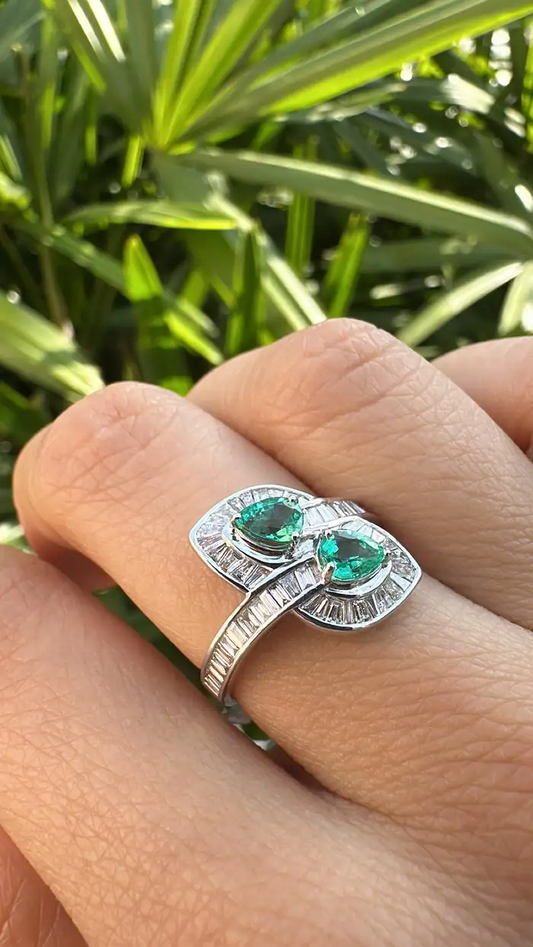 18k White Gold Tapered Baguette Diamonds Engagement Ring - Natural Pear Shape Zambian Emerald Wedding Ring
