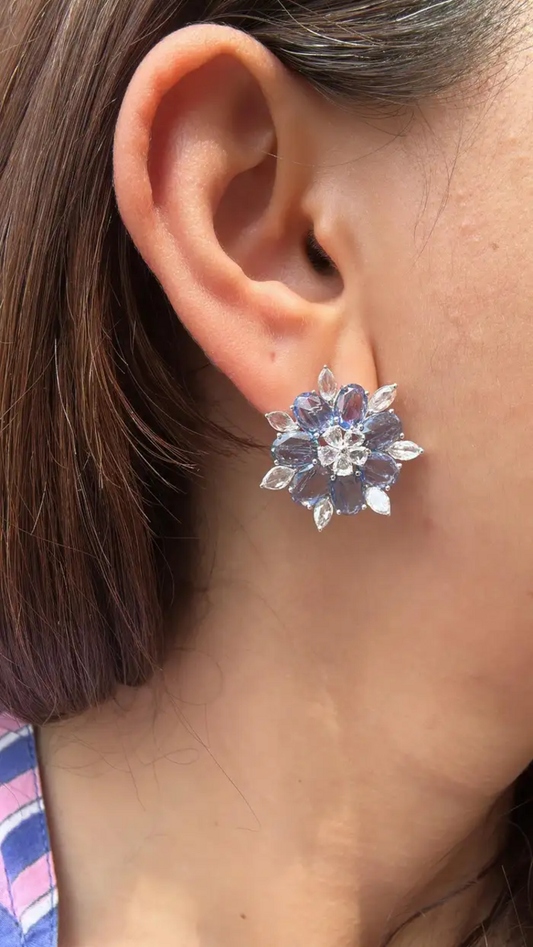 18k White Gold Rose Cut Diamond Stud Earrings - Natural Blue Sapphire Gemstone Earrings