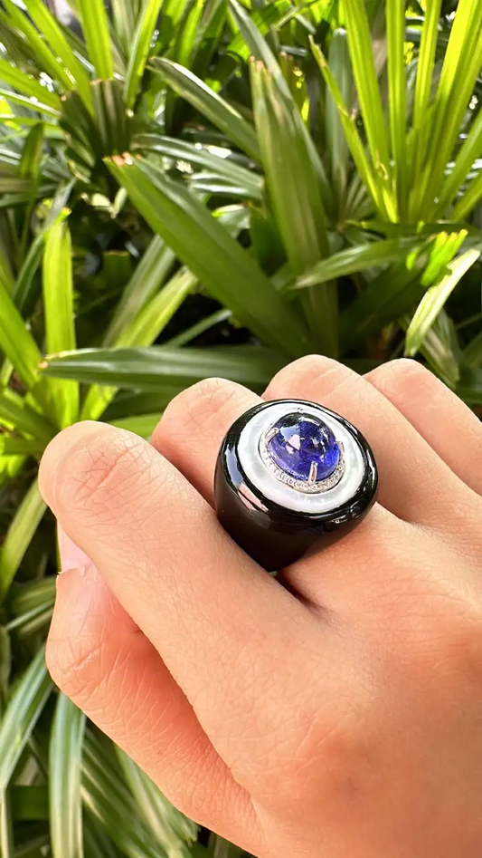 18k White Gold Ring - Natural Tanzanite & Mother Of Pearl Ring - Gold Diamond Cocktail Ring - Black Onyx Ring - Diamond Women Ring