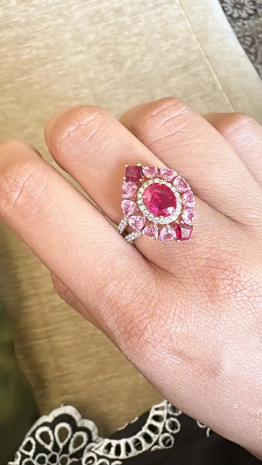 18K Yellow Gold, natural Mozambique Ruby, Pink Sapphire & Diamonds Cocktail Ring