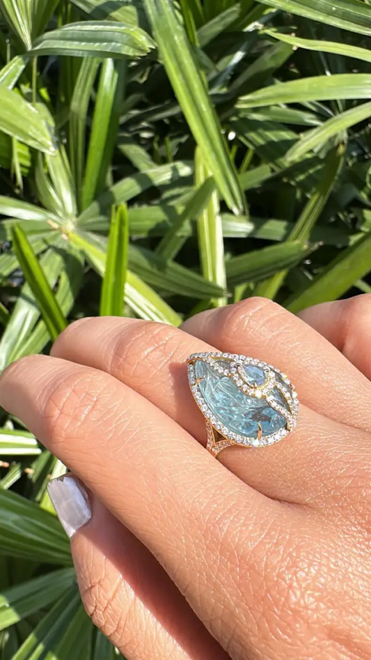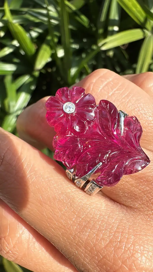 33.00 Ct. Carved Tourmaline Ring - 18k Gold Diamond Big Ring - Gemstone Floral Ring