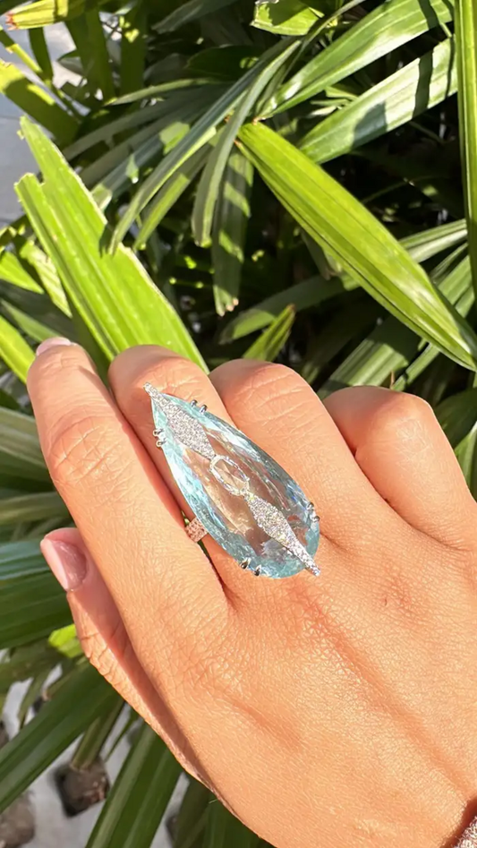 30.03 Ct Pear Shape Aquamarine Gold Ring - 18k White Gold Rose Cut Diamond Ring