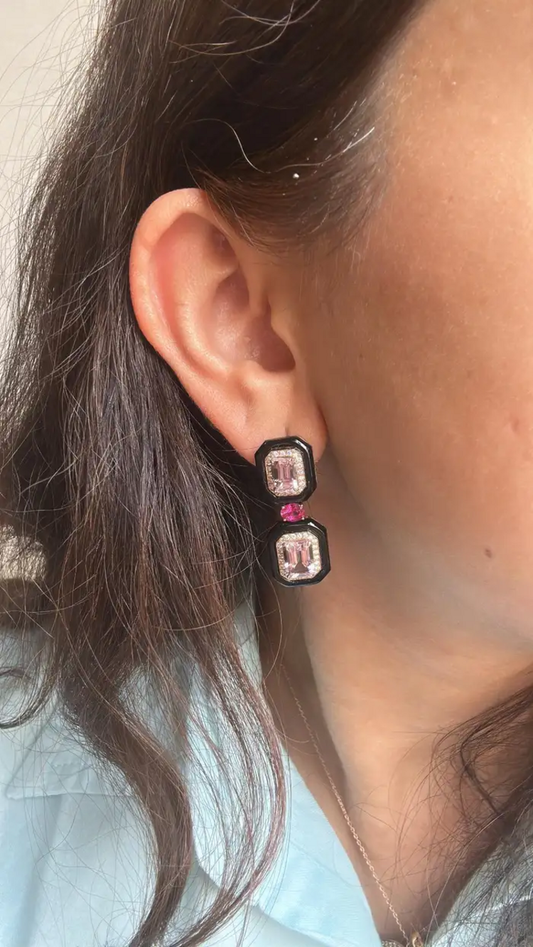 4.79 Ct. Morganite Gemstone Dangle Earrings - Solid 18k Rose Gold Diamond Wedding Earring - Natural Ruby Gemstone & Black Onyx Women Jewelry