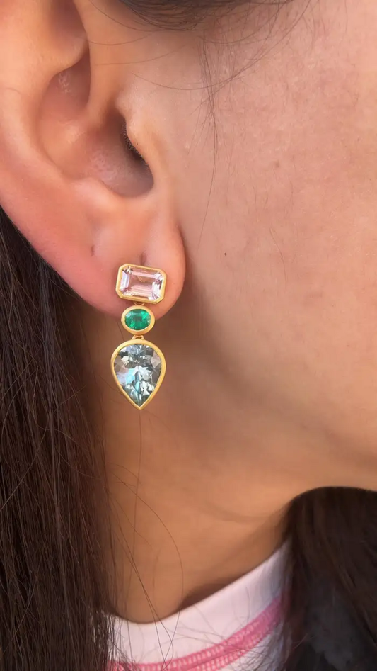 18K Yellow Matte Gold, Aquamarine, Emerald & Morganite Dangle Earring