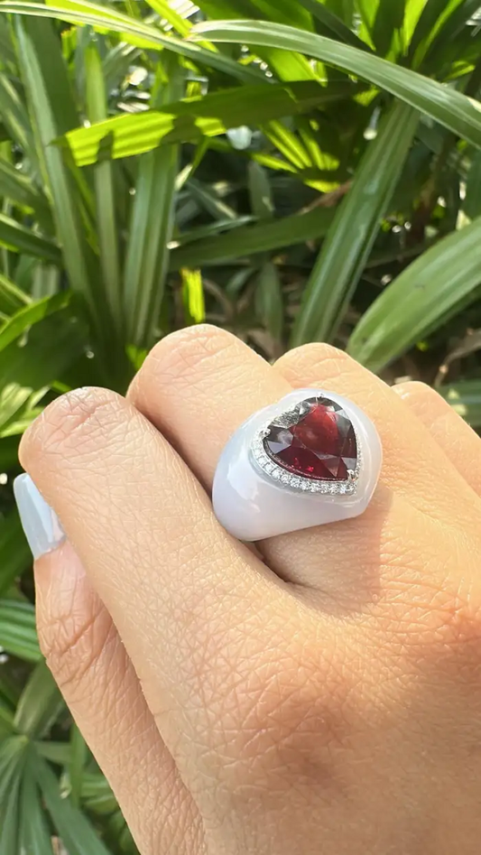 4.93 Heart Shape Rubellite & Chalcedony Anniversary Ring - 18k White Gold Diamond Cocktail Ring
