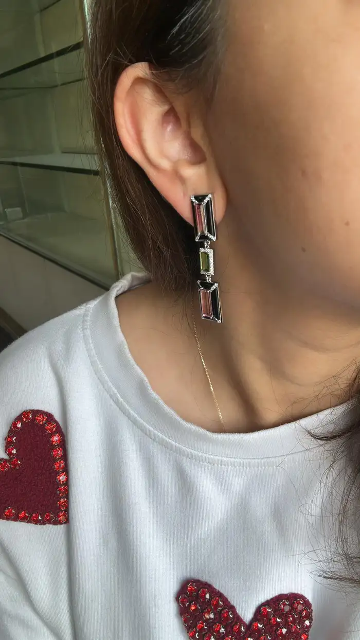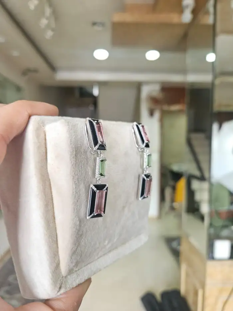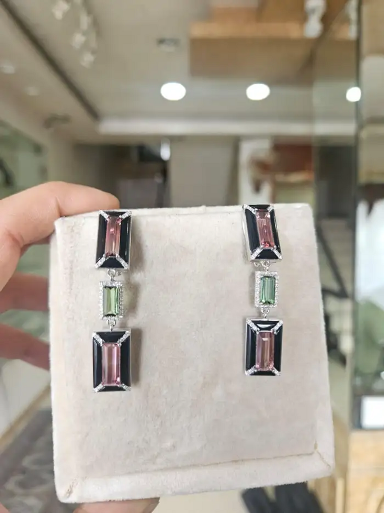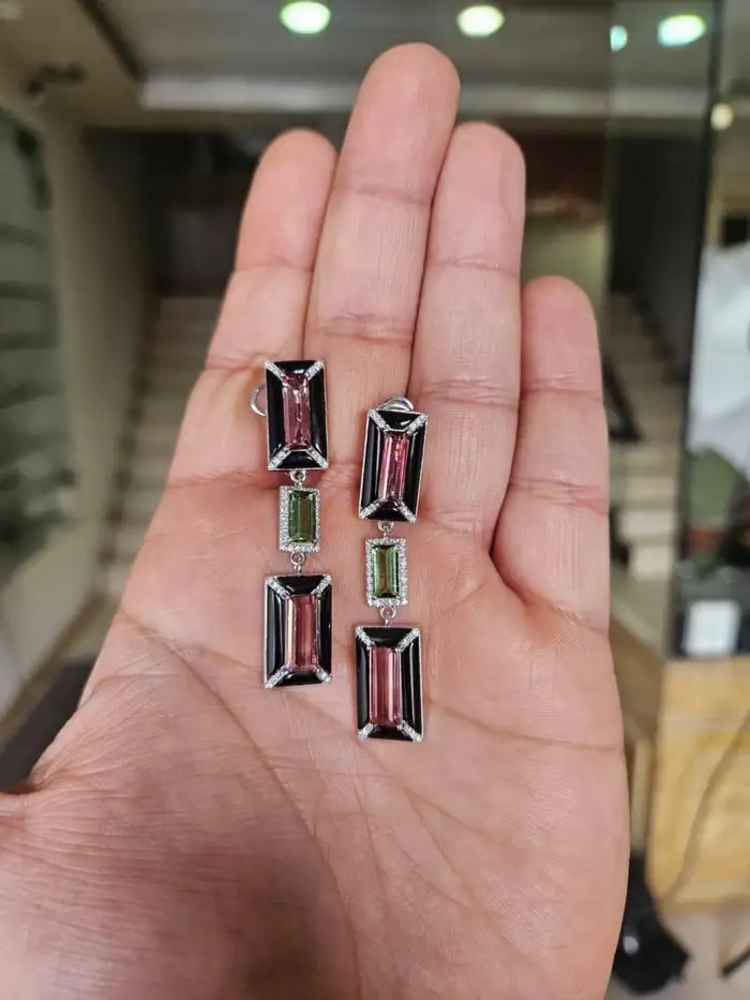 18k White Gold Diamond Dangle Earrings - Natural Tourmaline & Black Onyx Dangle Earrings