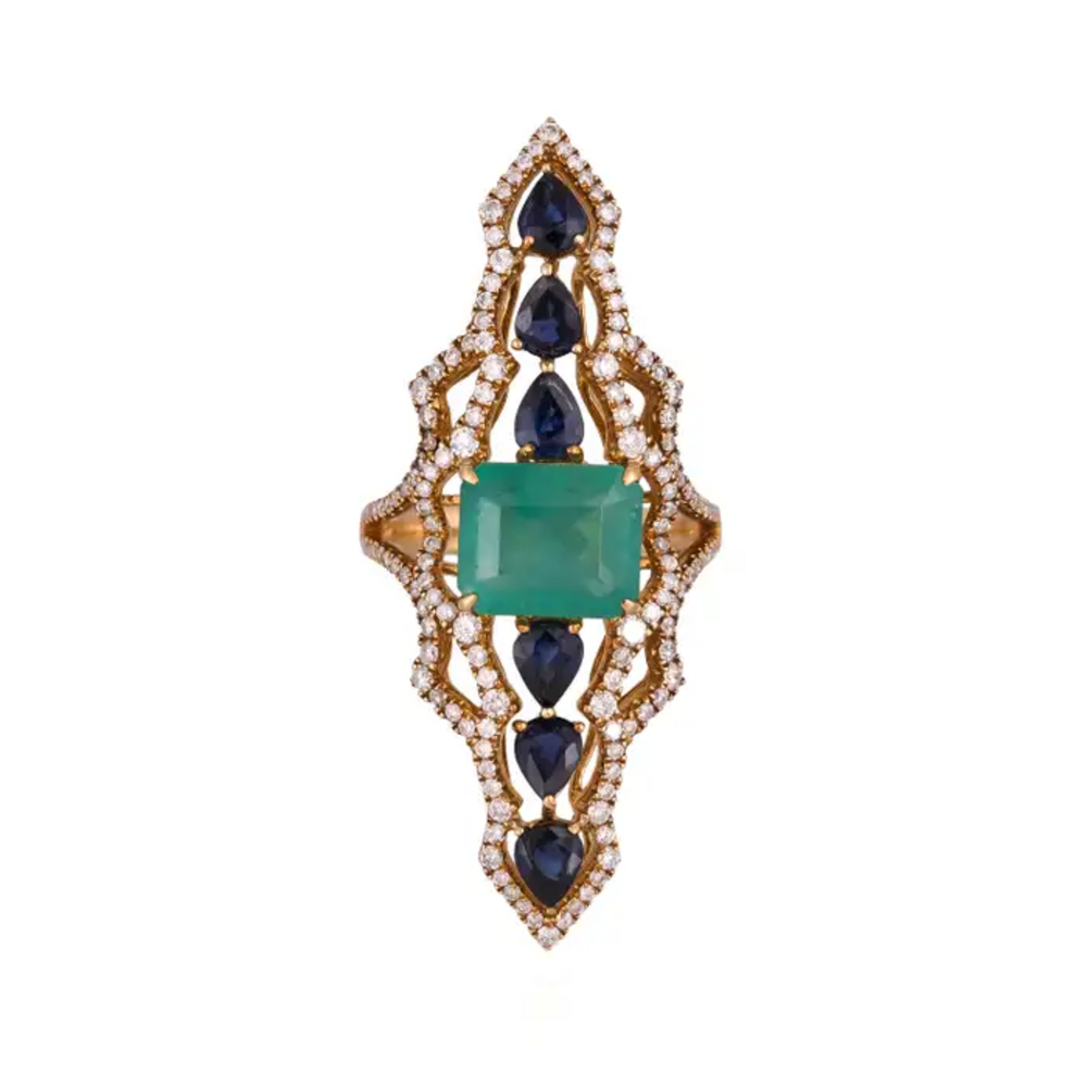 18k Yellow Gold Diamond Handmade Ring - Natural Colombian Emerald & Blue Sapphire Cocktail Ring