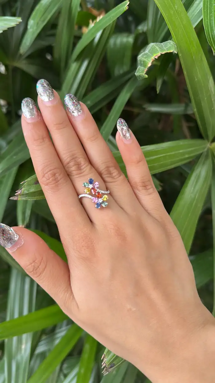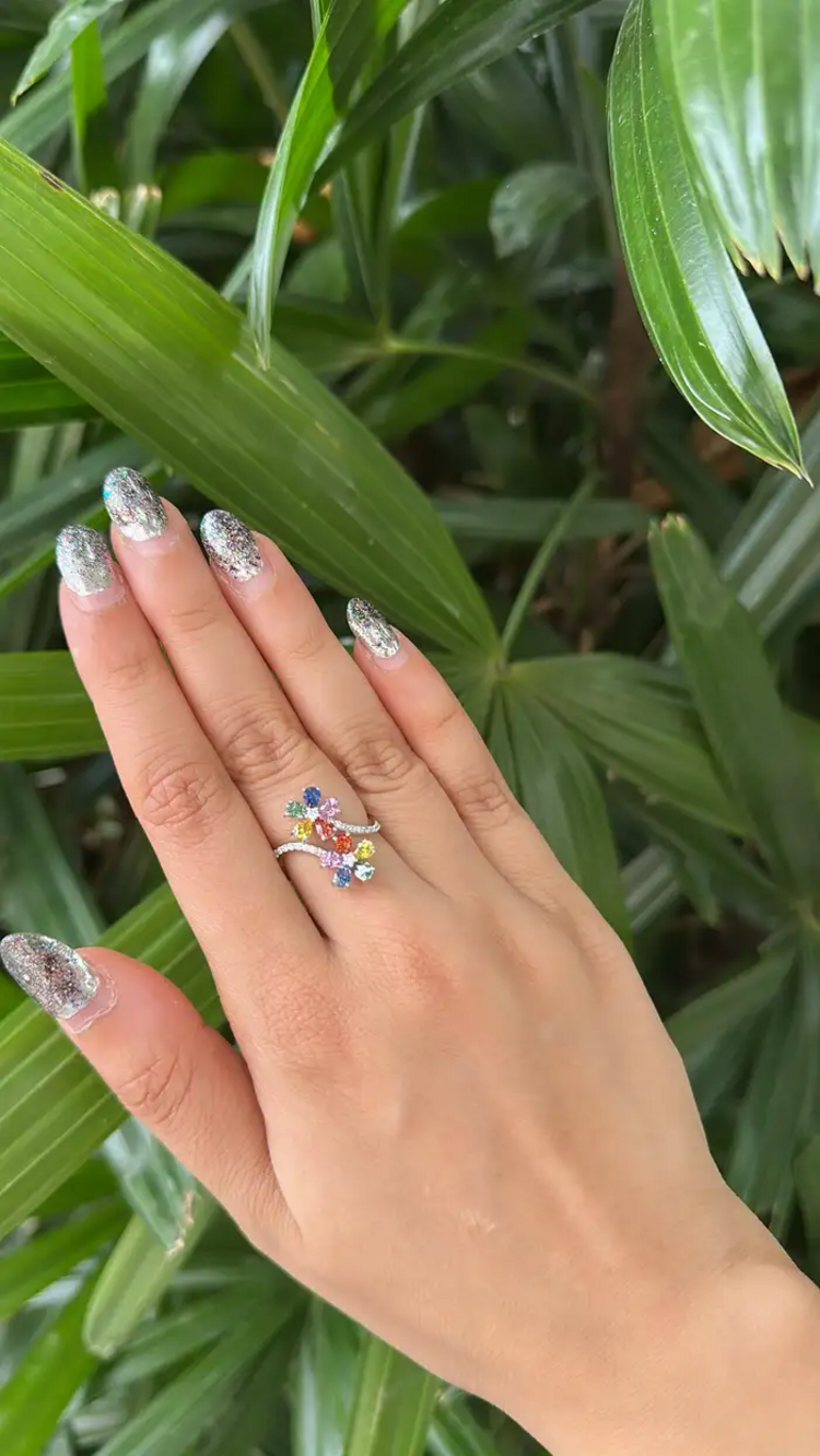 A very gorgeous and dainty, modern style, Multi Sapphires Engagement Ring set in 18K White Gold & natural Diamonds. The weight of the Multi Sapphires is 0.16 carats. The Multi Sapphires are of Ceylon (Sri Lankan) origin. The Diamonds weight is 0.06 carats. Net 18K White Gold weight is 3.34 grams. The Gross weight is 3.38 grams. The dimensions of the Ring are 2.00cm x 1.00cm x 1.00cm (L x W x D). The Ring is made is US Size 6.5 and can be changed on request.